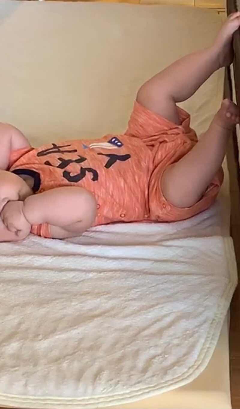 Yのおさがりの服を着てこんなダイナミックな格好で寝ている数日前のRです。