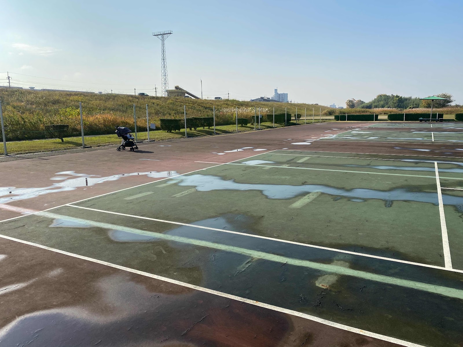 朝方に降った雨でテニスコートがこんな感じになっていました。