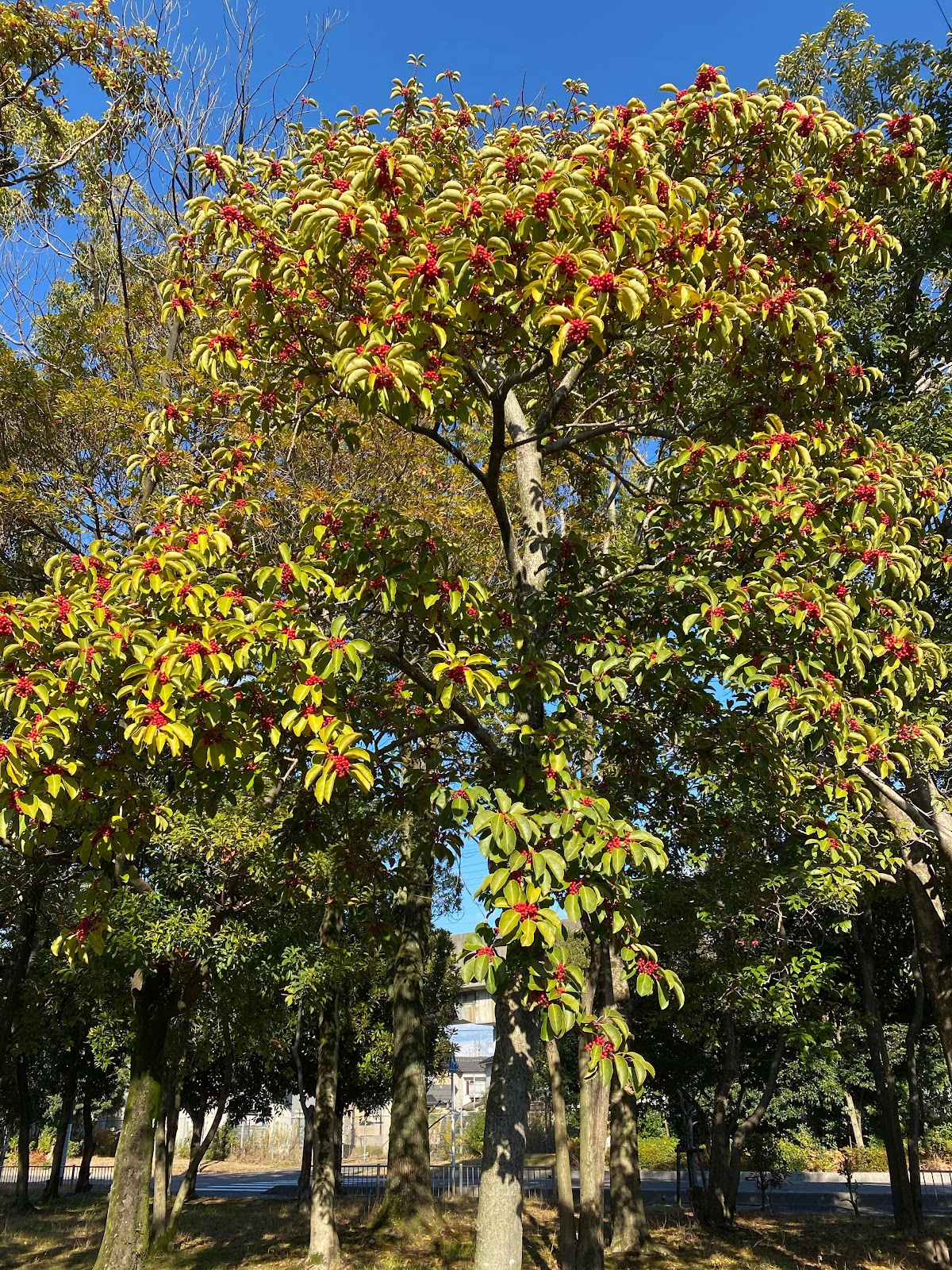 銀行へ行く途中の公園で赤い実をつけたクロガネモチを見ました。