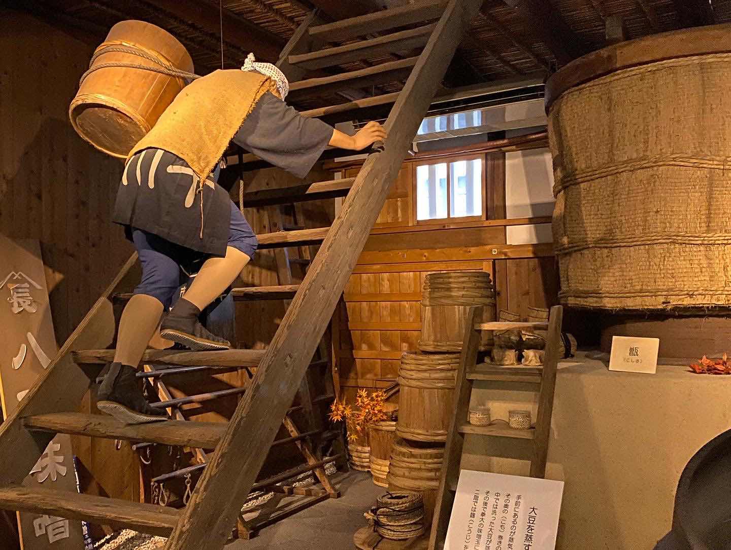 仕込みをする場面です。味噌玉を二階に運ぶ人や大豆を蒸している人もいます。