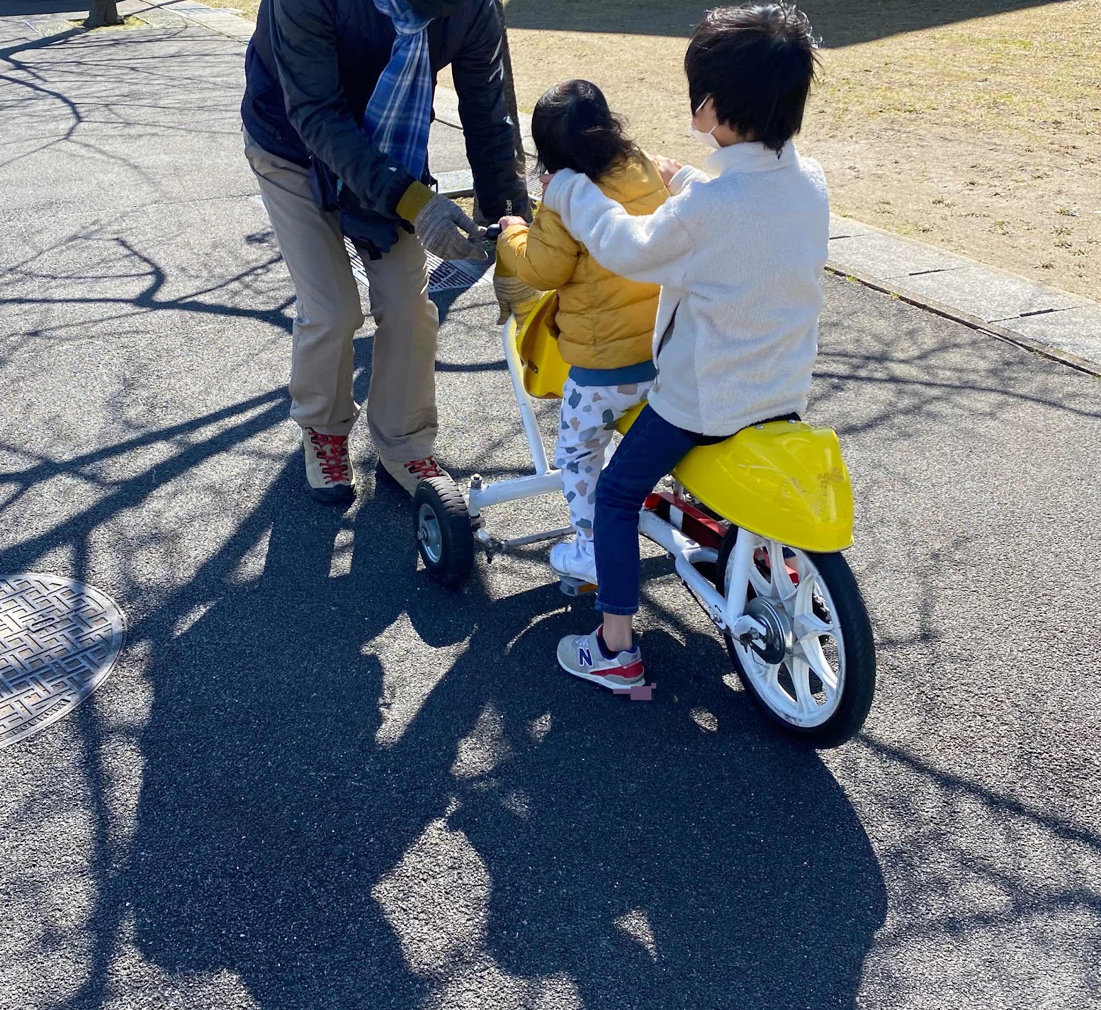Rはサドルを譲らず、Yは背後につかまっていました。