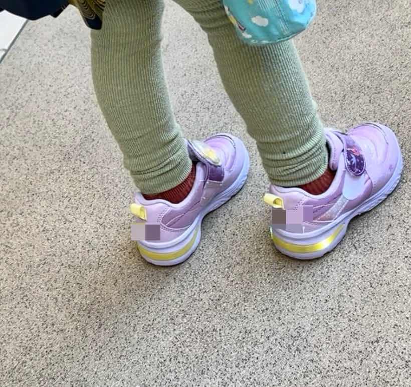 今日、Rの幼稚園バスのお迎えに行くと、降りてきたRはお気に入りの紫色の光るくつを履いていました。