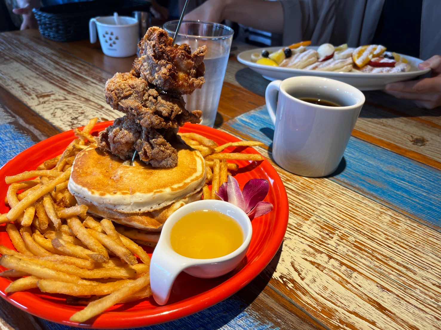 娘のパンケーキです。串にさされたチキンの唐揚げがインパクトがありました。