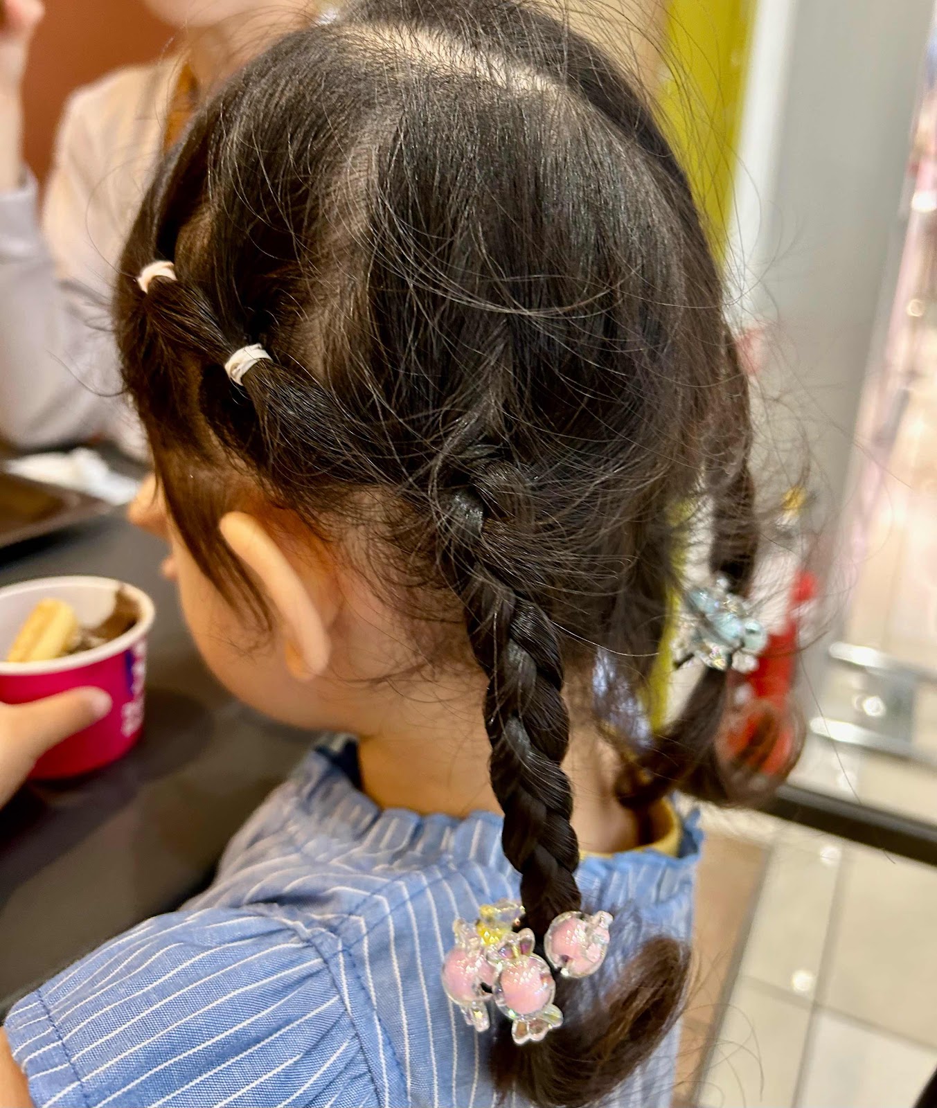 娘もRのリクエストに応えて、編み込んだり、リボンをつけたりして娘自身も楽しんでいます。