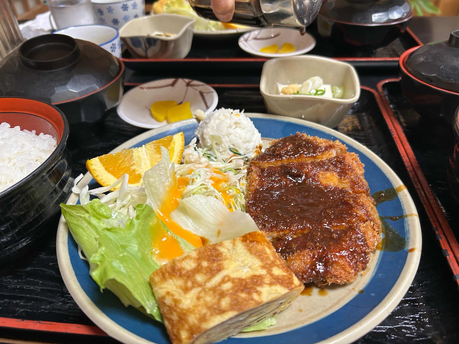 お肉のランチです。名古屋のお店らしく味噌カツメインで、卵焼き、ポテトサラダ、冷や奴がついています。