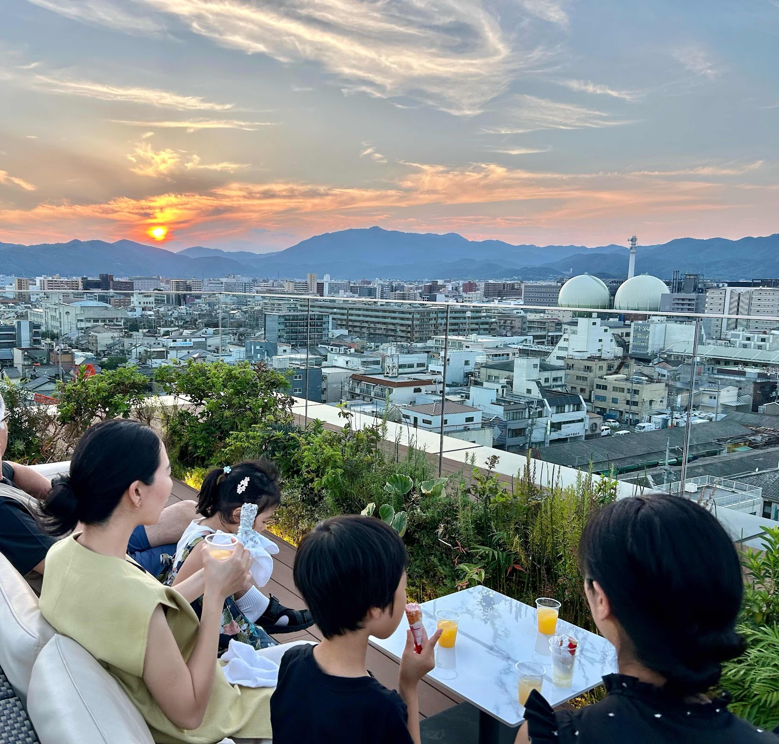 ホテルの屋上に座って沈む夕日を眺めています。