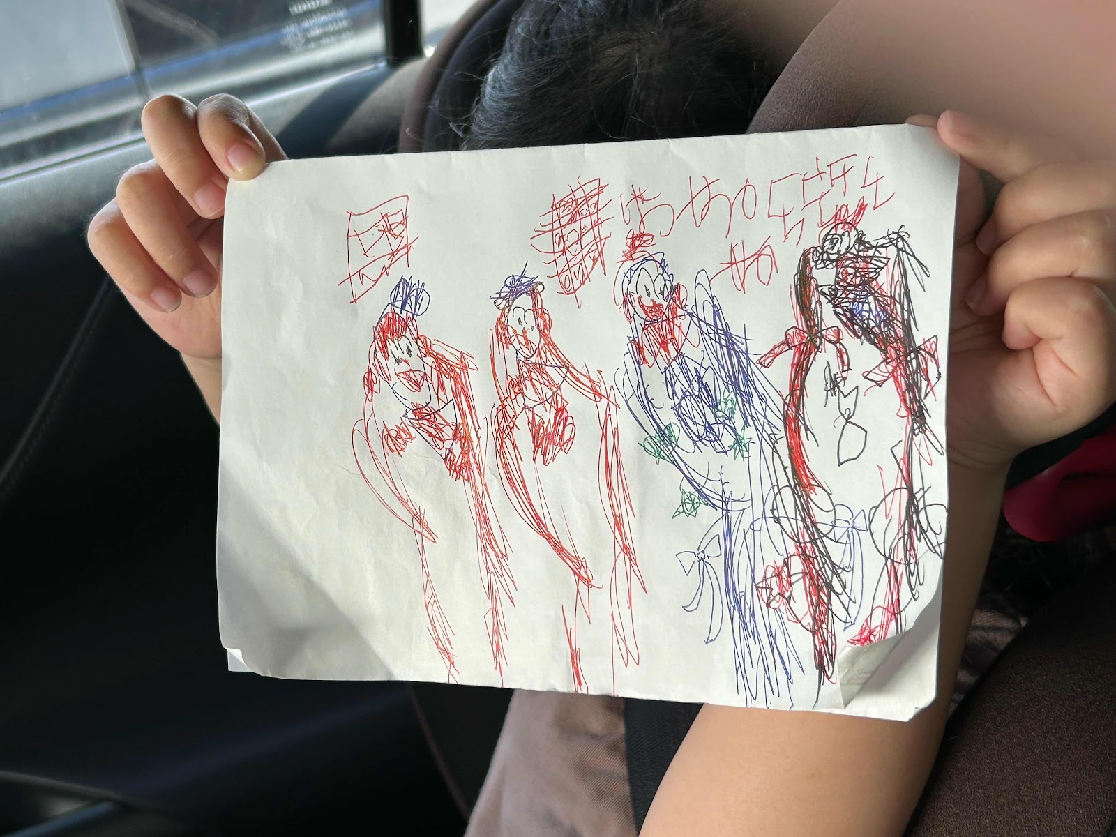 Rはママ、自分、私、大好きな長女の絵を書きました。