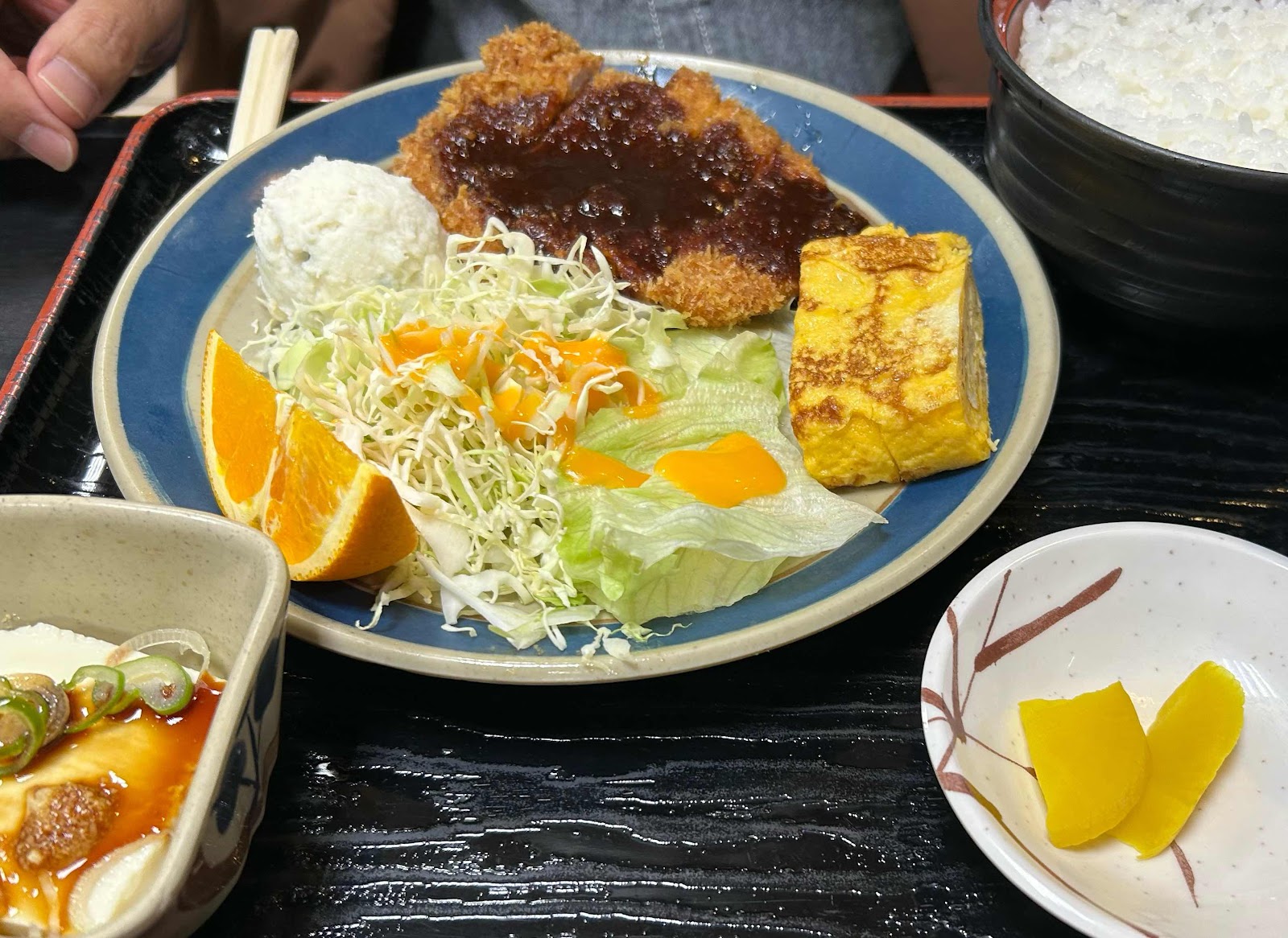 卵焼き、ポテトサラダ、冷奴が付いてくるのが嬉しいです。