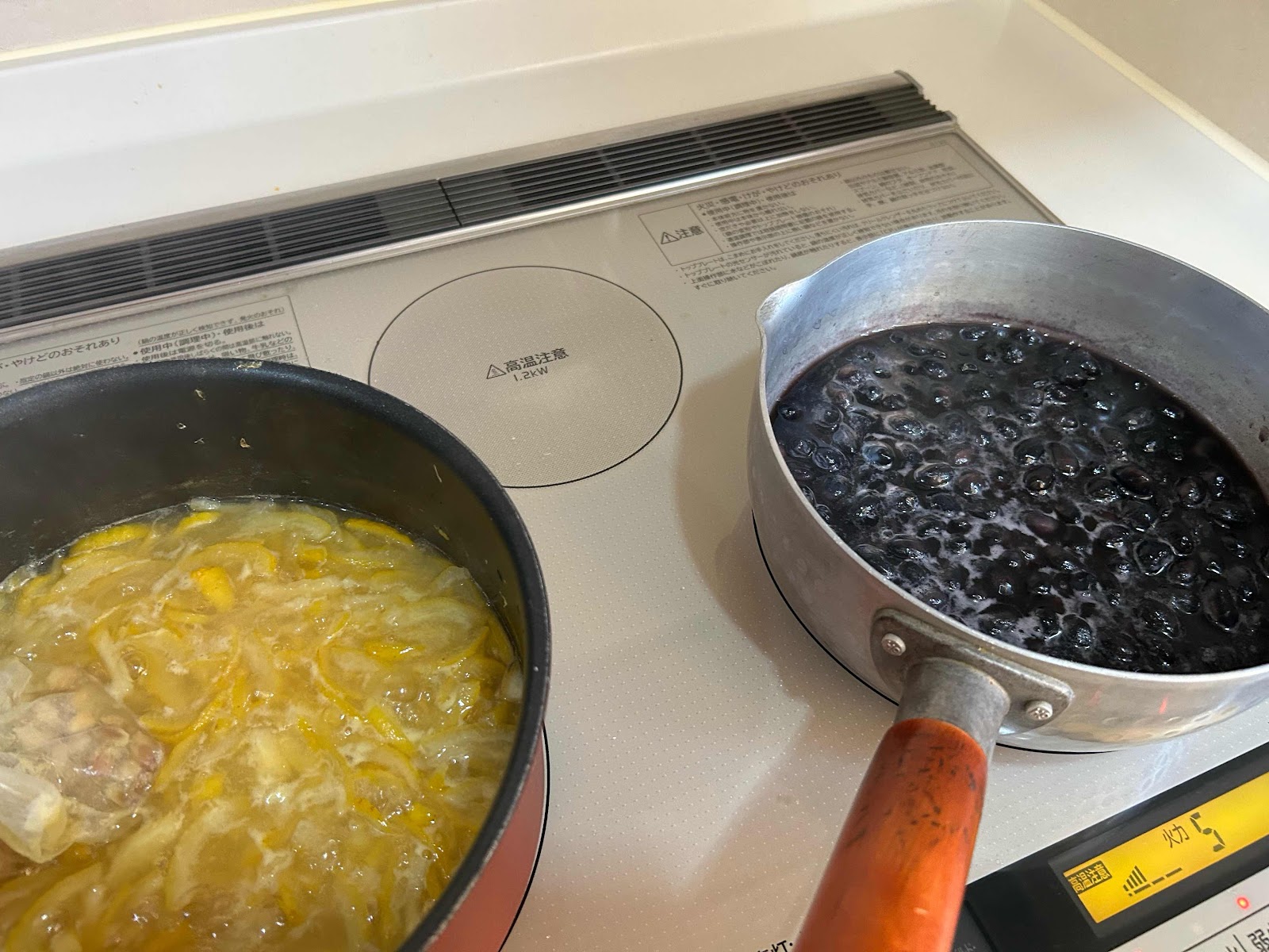 早速、今日の午後買ってきたゆずとレモンでゆずレモンジャムをつくり、隣のコンロで黒豆を煮始めました。