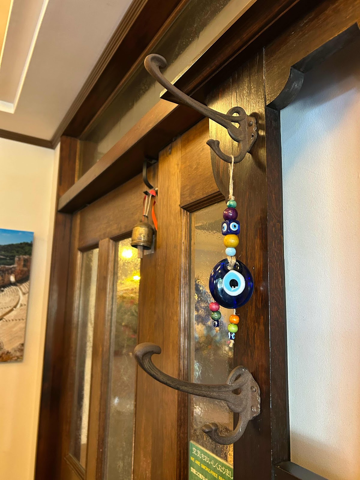 入り口の扉を開けると、トルコの魔除けナザールボンジュウが飾られていました。