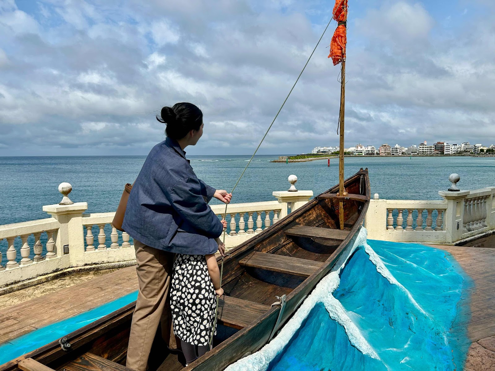 娘とRが力を合わせて帆をあげています。