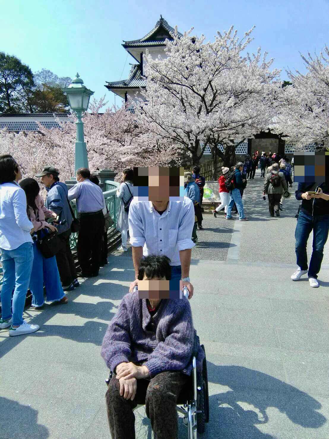 金沢城の石川門の桜をバックに母はにこやかな表情を浮かべています。