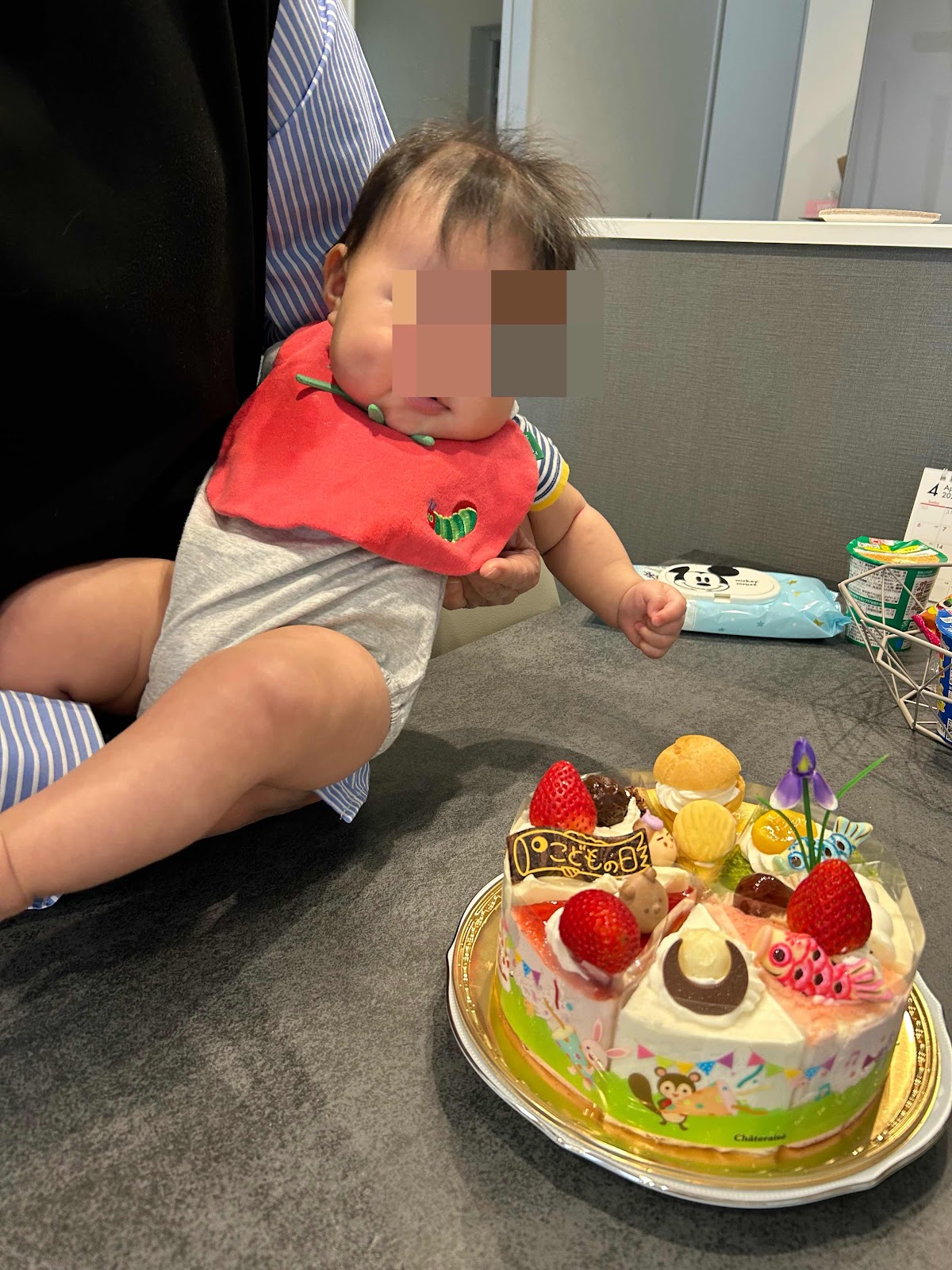 生後五ヶ月のSくんは、テーブルの上のケーキをじっと見つめていました。