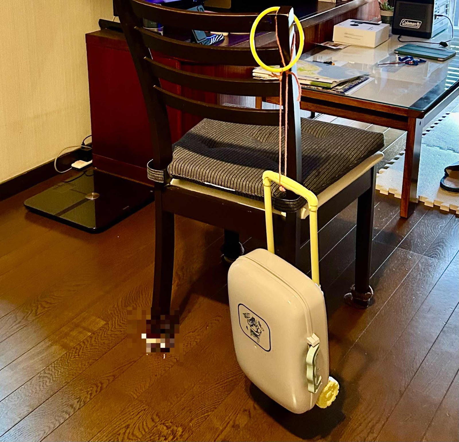 どうやらカバン置き場は、この椅子で上靴に見立てたスリッパも背もたれの中に差し込むようにと指示がありました。